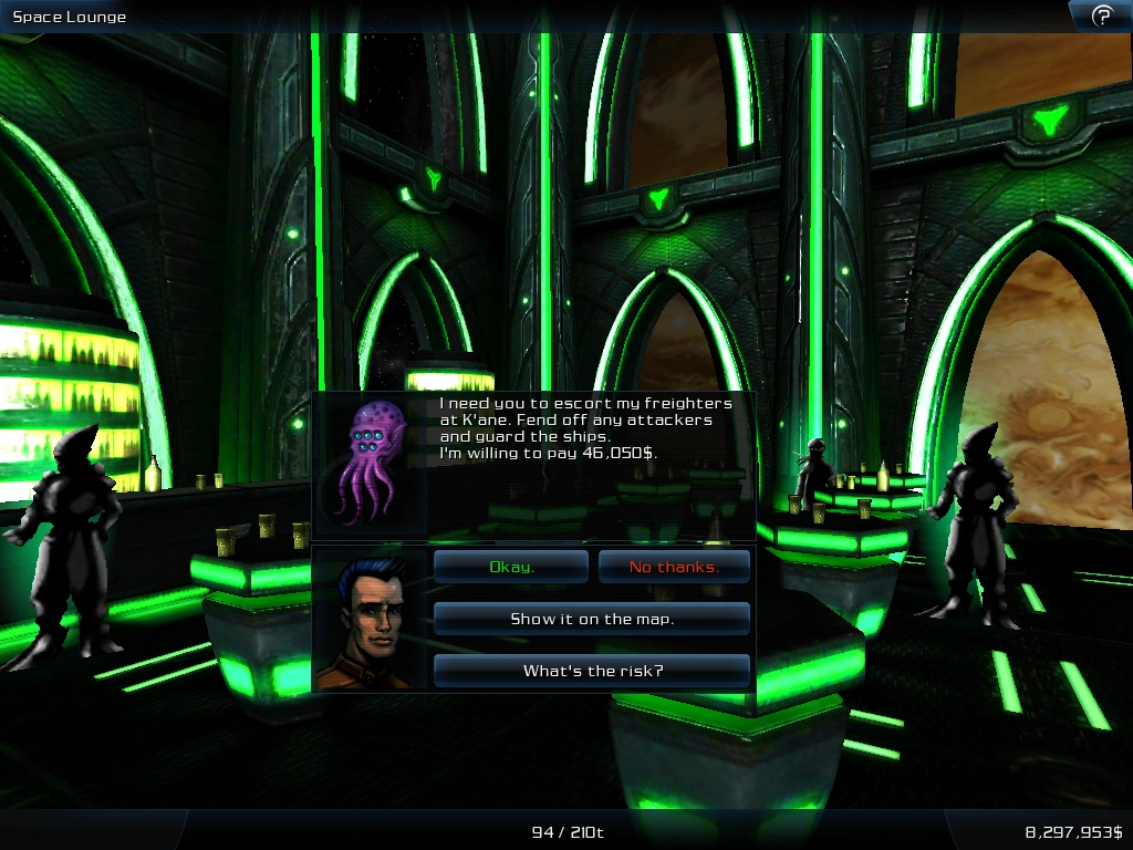 You will find a person in the space lounge or on the missions page who asks you to escort a fleet of freighters. You will be timed approximately three minutes while you fly with them. As you fly, ships will try to attack you in ever increasing numbers until the time runs out.