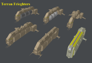 Terran freighters have designs similar to all of their ships, they have a pair of 4 engines on the sides and feature multiple antennas, carries 3 cargo containers. There is also a small raised part of the ship on top with fins and on the engines, which really makes them have a resemblance to a submarine.