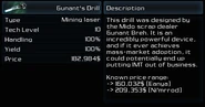 The cost of the blueprint and its materials justifies the performance of this Gunant's drill. Its 100% yield means that a maximum of 62t of ore can be extracted from a class-A asteroid. The 100% handling means that control of the drill head is more precise, not 'overreacting' to sudden changes in movement, making core mining easier. However, its handling does not mean that the drill is resistant to the regular misalignments.
