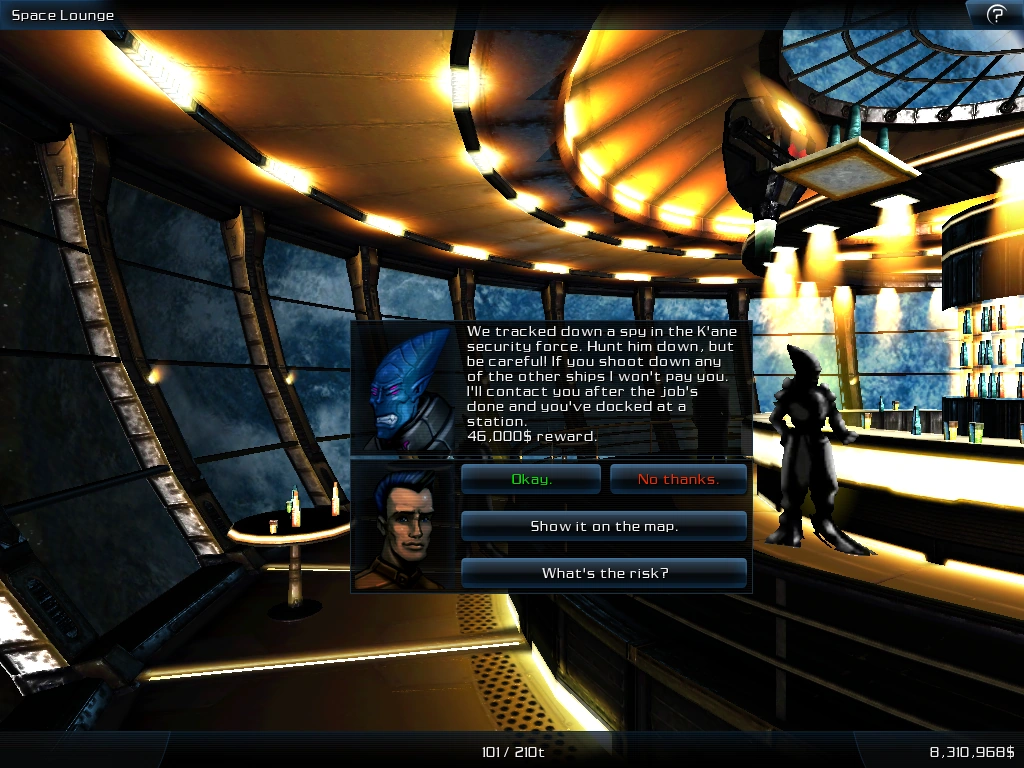 You will find a person in the space lounge who wants you to eliminate a spy in a space station's security force. You must go outside and, using your scanner, find the person marked 'Informer' and eliminate him. Don't destroy any of the other ships or you will fail the mission. Once you fire upon the informer, the rest of the security force will attack you, but if you dock at that station, you can pay a bribe to return the ships to neutral status. Once you dock, you will get your credits.