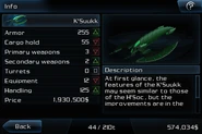 This ship only appears in shops after the player has purchased the Valkyrie add-on. If you want a more powerful Vossk ship except the boring old H'Soc, the K'Suukk is the ideal ship. With an armor of 255, it provides ample defense. The additional weapon systems makes it a decent for dogfights. Also, it comes with twelve slots for equipment. This surpasses the Aegir, which costs almost 2M credits more. It is a heavy fighter ship that is worth it for its price. At the beginning of the Valkyrie storyline, Mekant Orskk gives Keith the K'Suukk, so that he can steal it for Alice and Cornelious. The prototype K'Suukk was equipped with three scatterguns that were the Berger FlaK 9-9 scatterguns.
