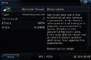 When installed, the force of a Mp'zzzm Thrust will augment the steering of a ship, reducing its turning radius. This, in numbers, means that it adds 100% of a ship's handling to its total. A ship with 100 handling will have 200 handling with this thruster installed. The Rhino, having the lowest handling of 30, will have 60, and the Dace, having the highest handling of 162, will have 324.