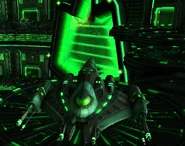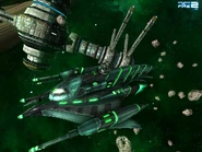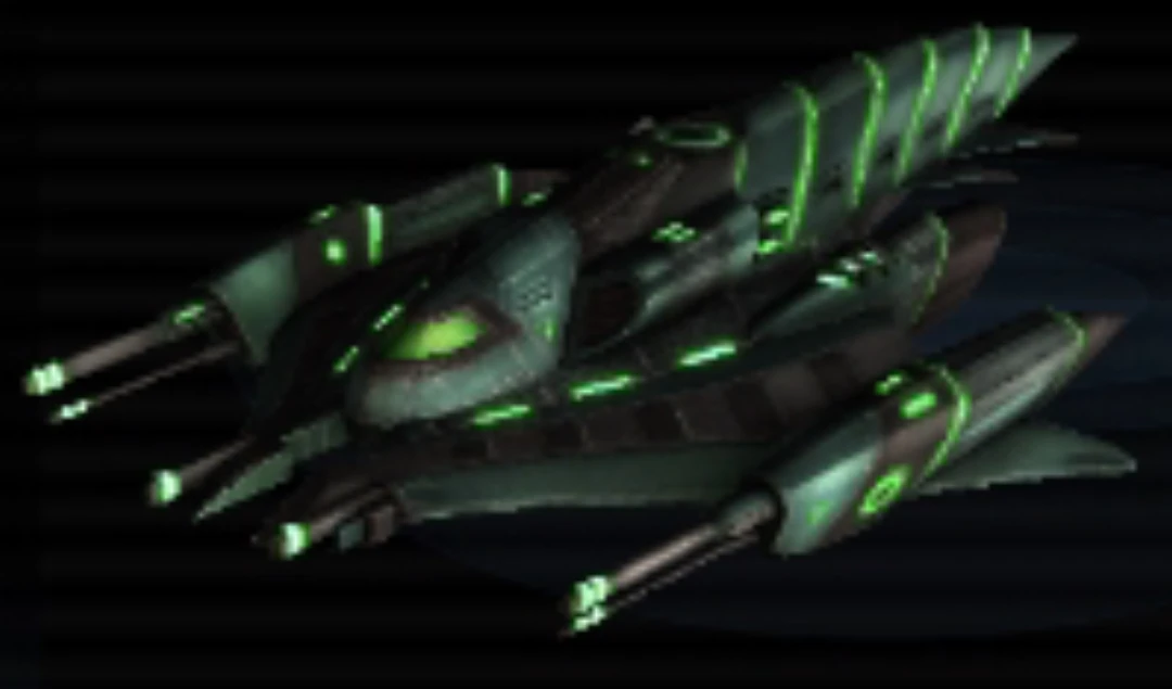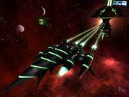 This is the Vossk "ultimate ship", something that was conspicuously absent in the initial release. This ship only appears in shops after players have purchased the Valkyrie add-on. It is also the only Vossk ship that has the ability to equip a turret in the game. It's an excellent fighter excepting the weak handling of only 70 making it the least agile of the Vossk Ships (This can be improved by adding a Pulsed Plasma Thrust). However, a negative feature of the S'Kanarr is that it has 11 module slots compared to the Veteran with the 12 module slots or the Nemesis with the 14 module slots (effectively fifteen due to the integrated Khador Drive). It is also a ship with a large cargo of 150 which makes the S'Kanarr the largest of the Ultimate Ships. If you want to combat and trade, this could be the ideal ship if you have enough credits, unless if you don't mind having no turret slots, in which the Gator Custom would be better for you. In the Valkyrie storyline, Alice tells Keith to do auto-turret testing in the planet Scion with a S'Kanarr.