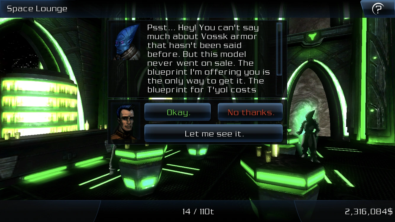 An ultra-hard armor from the Vossk elite production. This armor is the pride of Vossk industry and provides the strongest protection in the galactic market today. T'yol means "forehead", not to be confused with T'yool, which refers to the Vossk sex organs. This mix up has been the undoing of many an unfortunate trader...