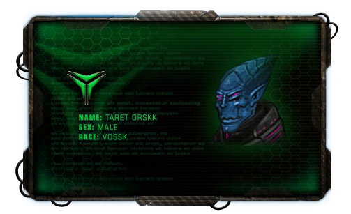This unfortunate Vossk owes Alice a favour, and that's a bad position to be in! Taret Orskk was stranded in his damaged fighter after fleeing a dogfight and was discovered near the Valkyrie station. With his ship repaired and his life spared, he was allowed to return to his clan, on the condition that he can be called at some point for a favour.