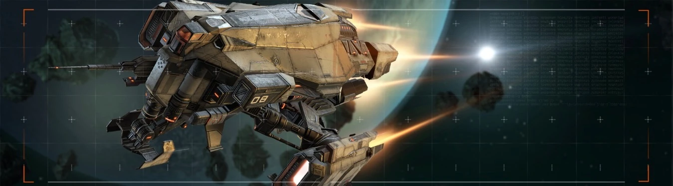 A big lumbering swollen egg sack of a ship. It's an efficient choice if what you're looking for is shooting lots of things and taking lots of hits. Not much of a dog fighter, but it's definitely a damage outputter. Lots of armor, lots of room for weapons. It tends to act as a gunboat to support faster more agile ships. Pain in the ass to fix up.