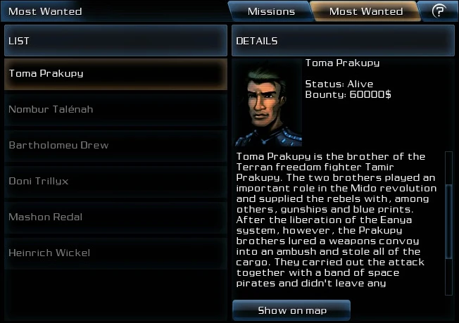 Toma Prakupy is the brother of the Terran freedom fighter Tamir Prakupy. The two brothers played an important role in the Mido revolution and supplied the rebels with, among others, gunships and blue prints. After the liberation of the Eanya system, however, the Prakupy brothers lured a weapons convoy into an ambush and stole all of the cargo. They carried out the attack together with a band of space pirates and didn't leave any survivors. Furthermore, rumor has it that Toma's brother Tamir is a Nivelian double agent, who turned his back on his former employers and joined the Mido Alliance as soon as he got his pay check.